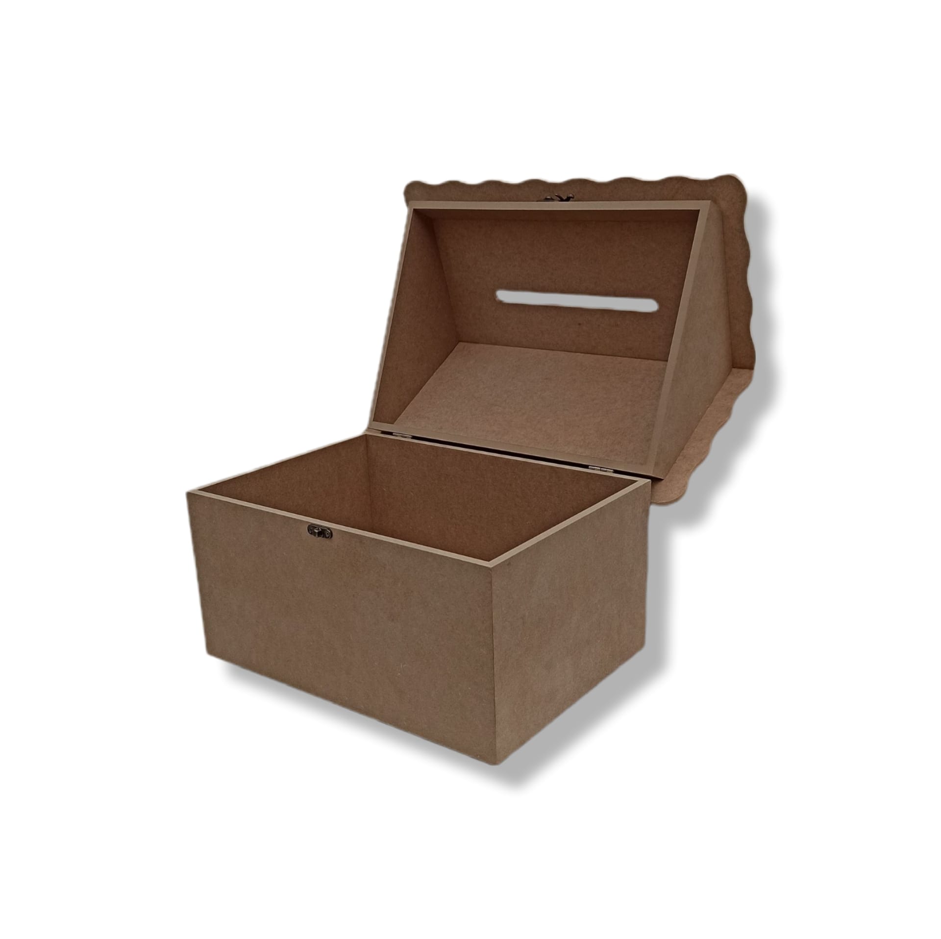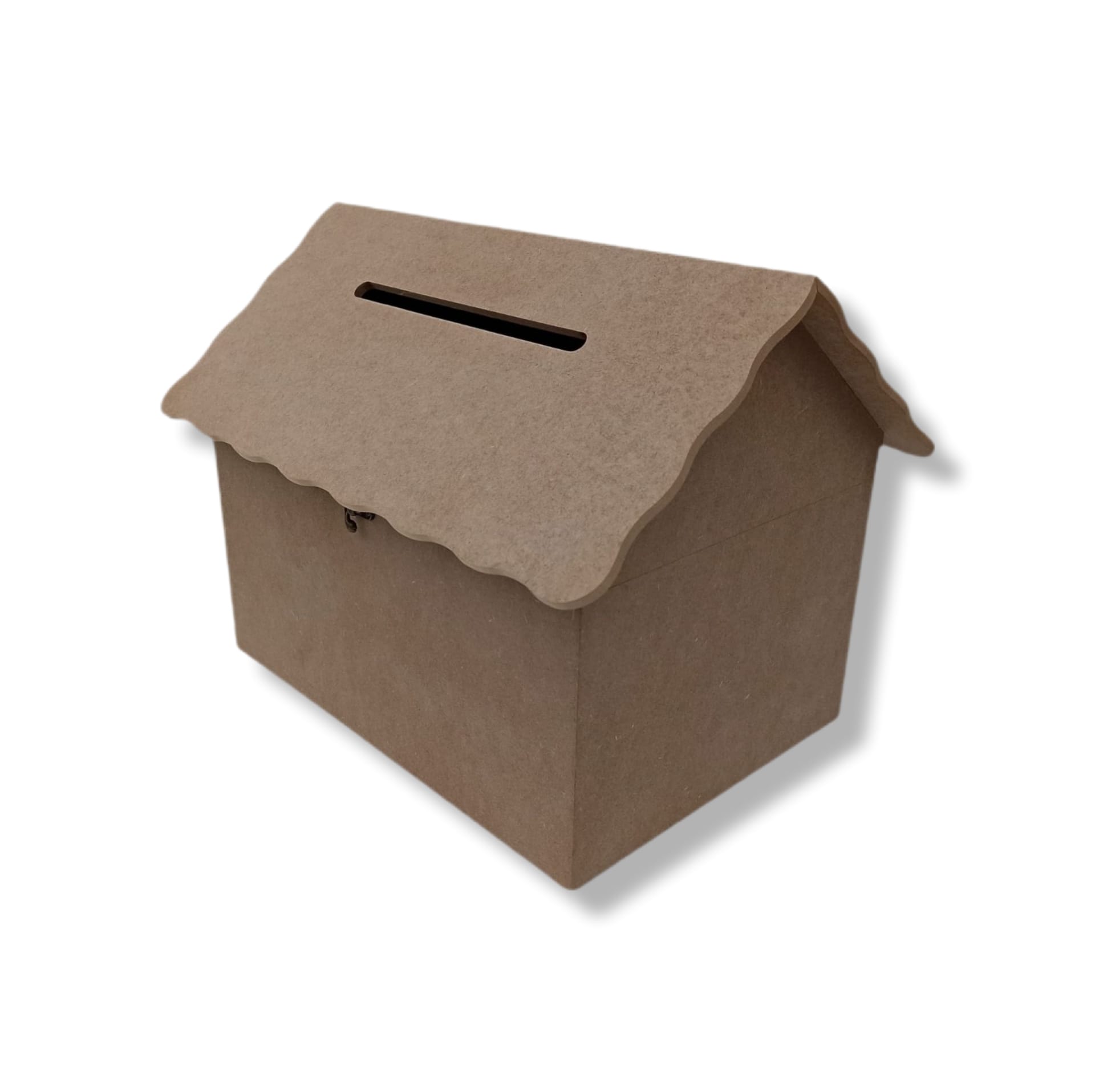 Cufar din MDF, pereti si capac de 8 mm, fund de 2.5 mm realizat sub forma de casuta, cu capac rabatabil si fanta pentru introducerea plicurilor sau mesajelor